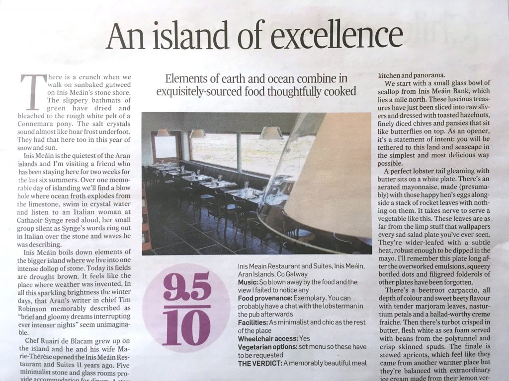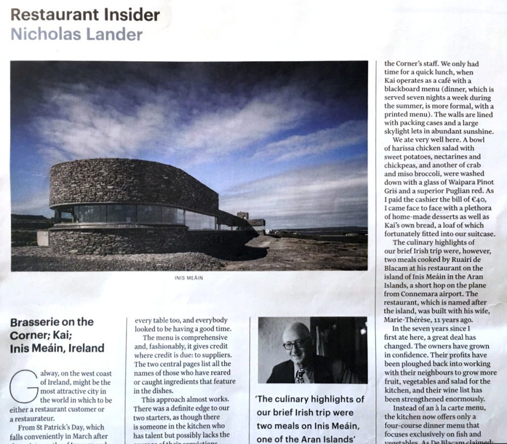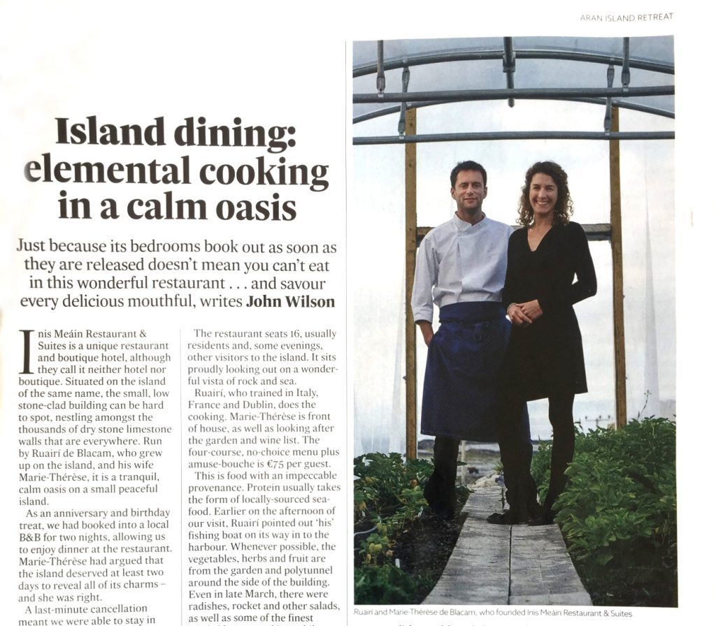 The culinary highlights of our brief Irish trip were, however, two meals cooked by Ruairi de Blacam at his restaurant on the island of Inis Meáin in the Aran Islands, a short hop on the plane from Connemara airport. The restaurant, which is named after the island, was built with his wife, Marie-Thérèse, 11 years ago.