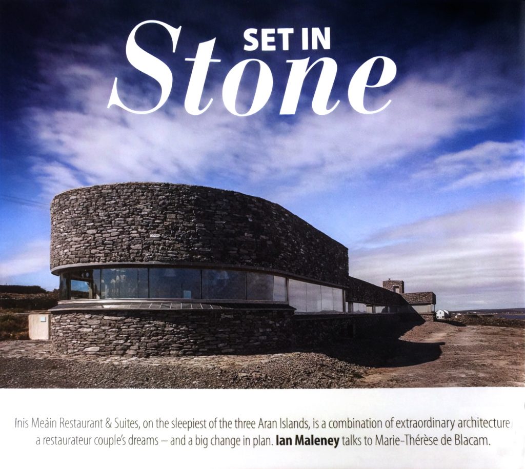 Inis Meáin ist die mittlere der drei Aran-Inseln in der Galwaybucht 20 Kilometer vor der Westküste Irlands. Die Natur der nur fünf Kilometer langen und frei Kilometer breiten Insel ist einzigartig. Ihre Landschaft ist geprägt von Stein, schroffen Felsen und dem Klima des Nordatlantiks. Für das Ehepaar Ruairí und Marie-Thérèse de Blacam, er auf Inis Meáin aufgewachsen, entstand während vieler Reisen der Wunsch, auf der Insel mit einem besonderen Projekt heimisch werden zu können. 2008 eröffneten sie dann ein kleines Restaurant mit Gästesuiten. Die typische Landschaft von Inis Meáin sollte in der Architektur reflektiert werden und zugleich das moderne Design des Bauwerks akzentuieren. Die Architekten de Blacam und Meagher setzten diese Ideen in die Realität um. Durch die Natursteinfassade scheint das Gebäude wie aus der Insel erwachsen zu sein. Innen bestimmen einfache, grau geputzte Wände, Holzparkettböden und große Fensterfronten die Räume. Die fünf Suiten bieten je zwei Personen Platz. Von einem großen, offenen Raum mit Wohn – und Schlafbereich und vorgelagertem Freisitz hat der Besucher durch die verglasten Fensterfronten einen freien Blick auf sowohl die Insel als auch die Bucht. In dem mit Awards ausgezeichneten Restaurant in zeitgenössischen Stil wird lokale Küche wie fangfrischer Lobstermund Krabben serviert. Außerhalb eine 130 m² große, exklusive Apartmentsuite gemietete werden.